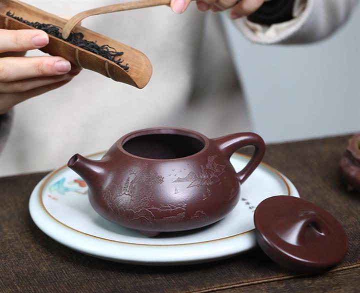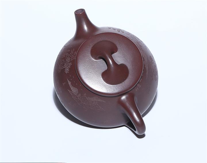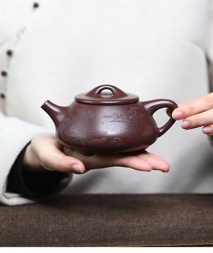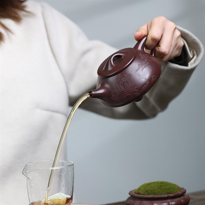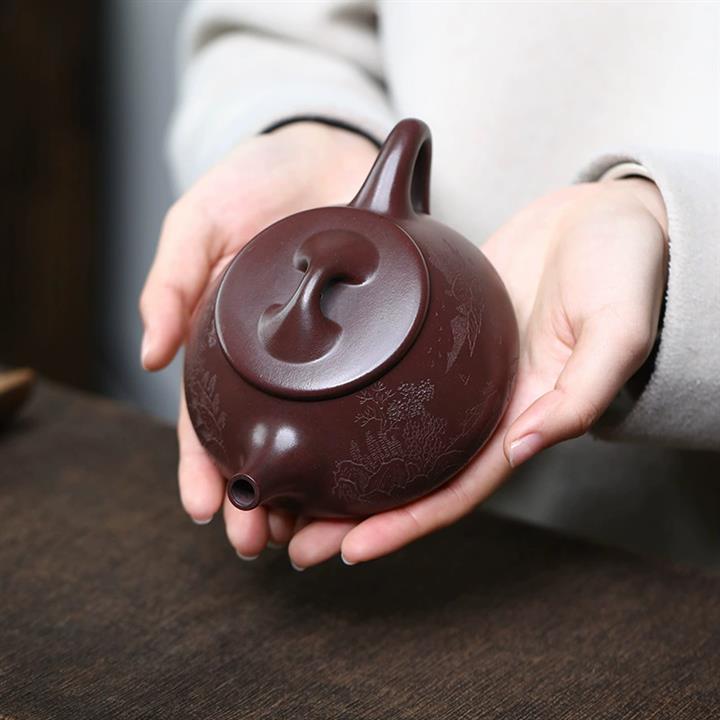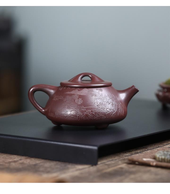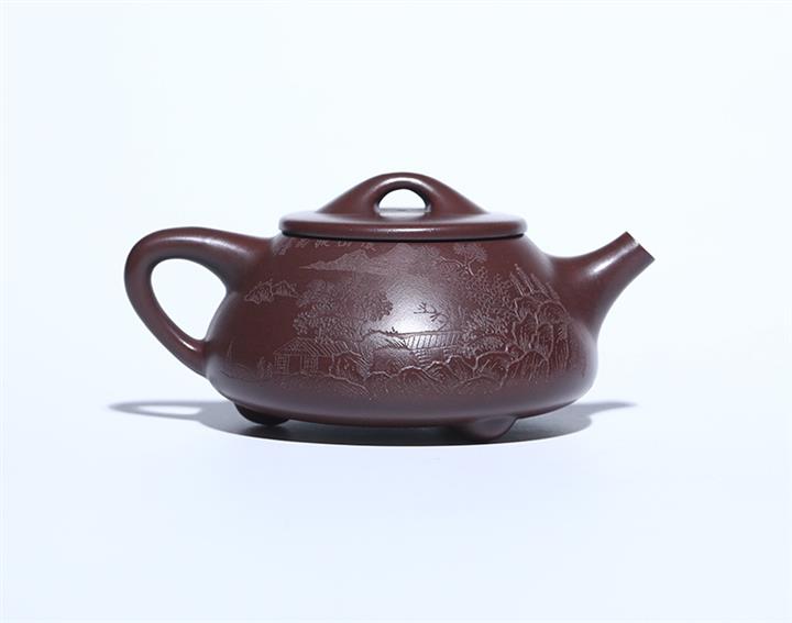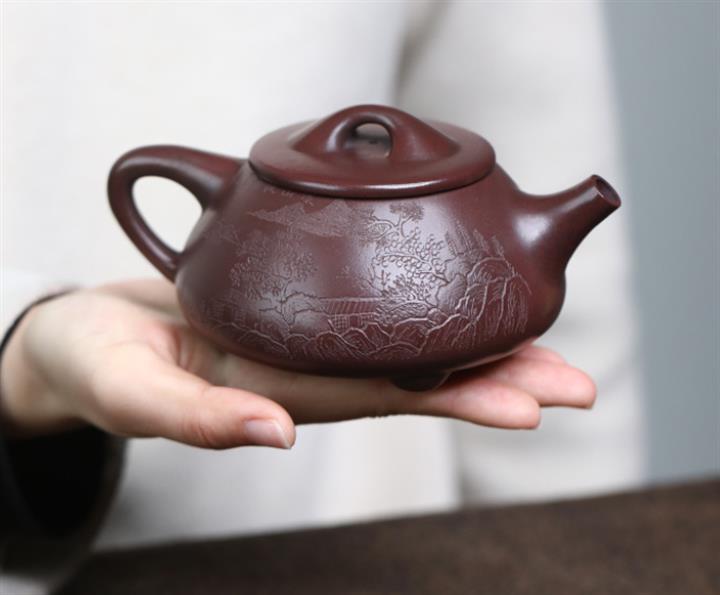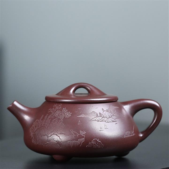 310cc原礦紫泥純手工刻繪山水景舟石瓢泡茶壺POT10216