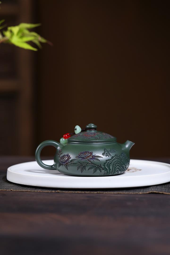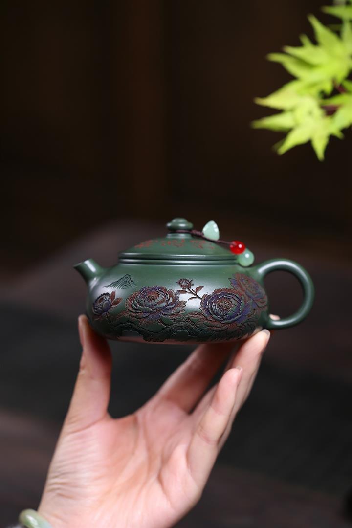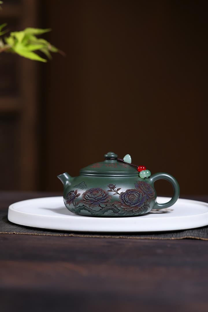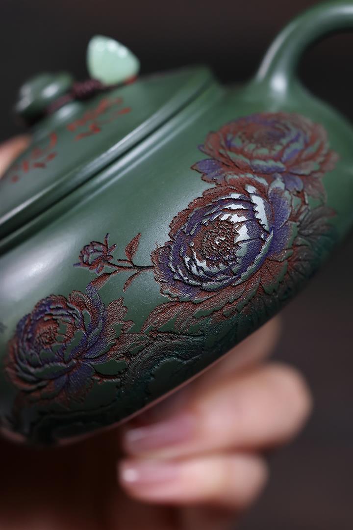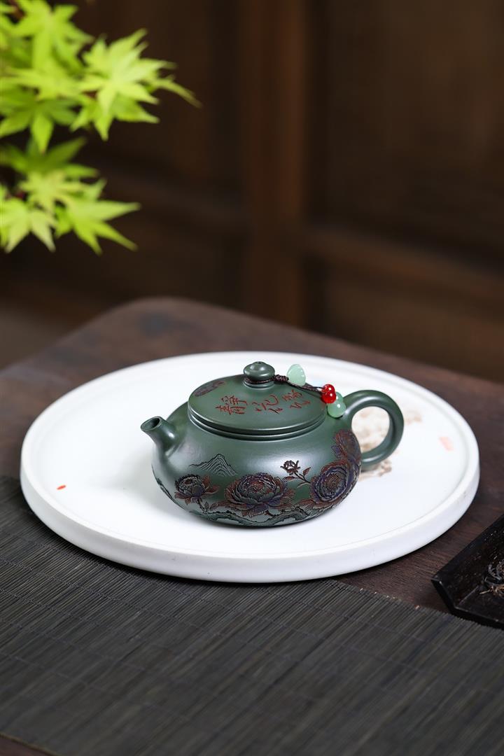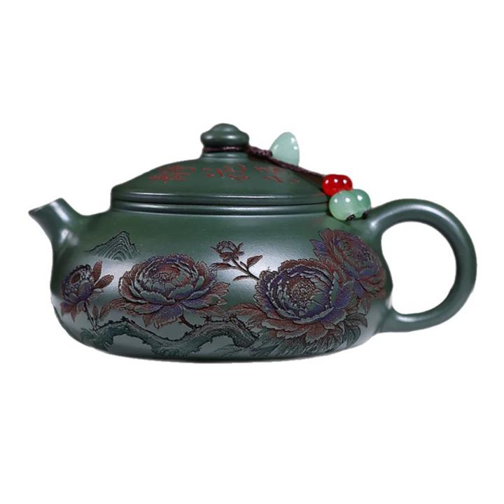 190cc原礦綠泥滿刻牡丹寒江泡茶壺POT10220