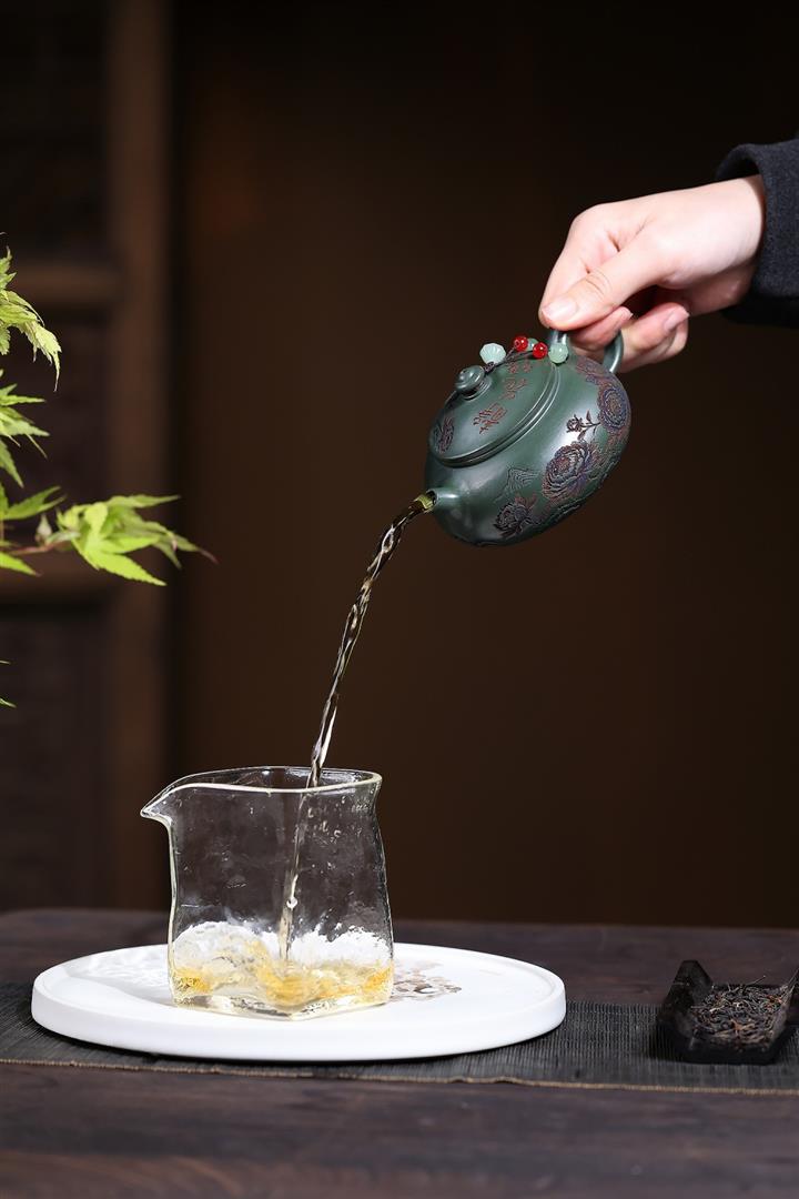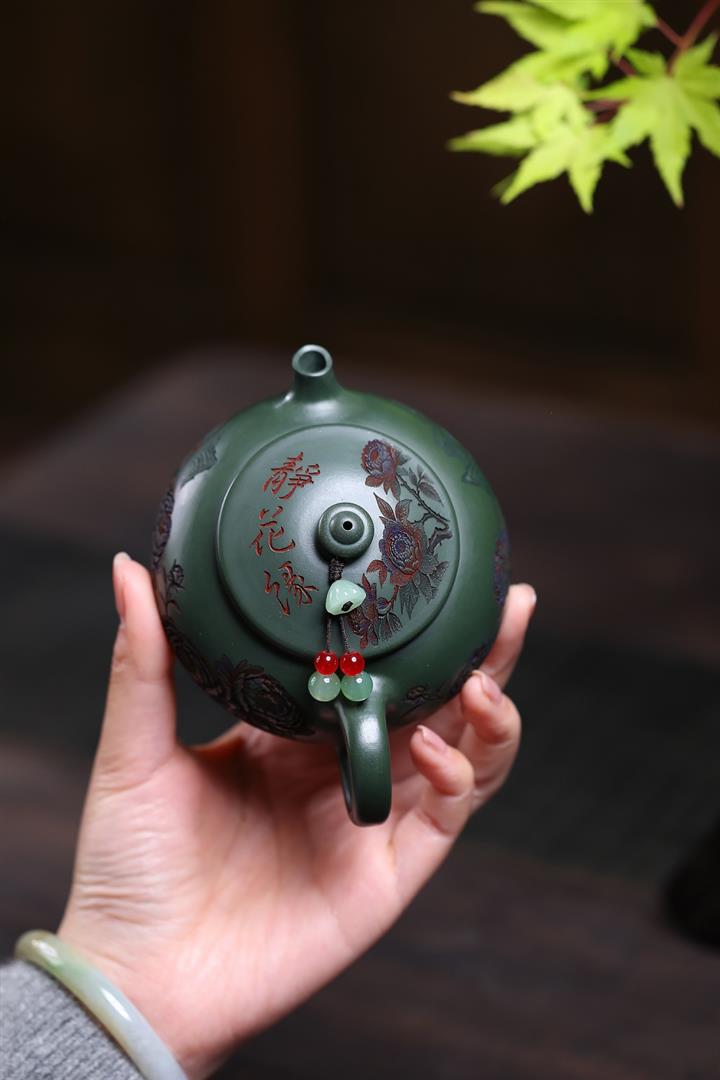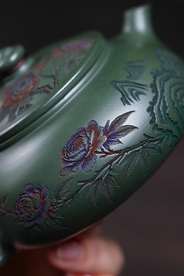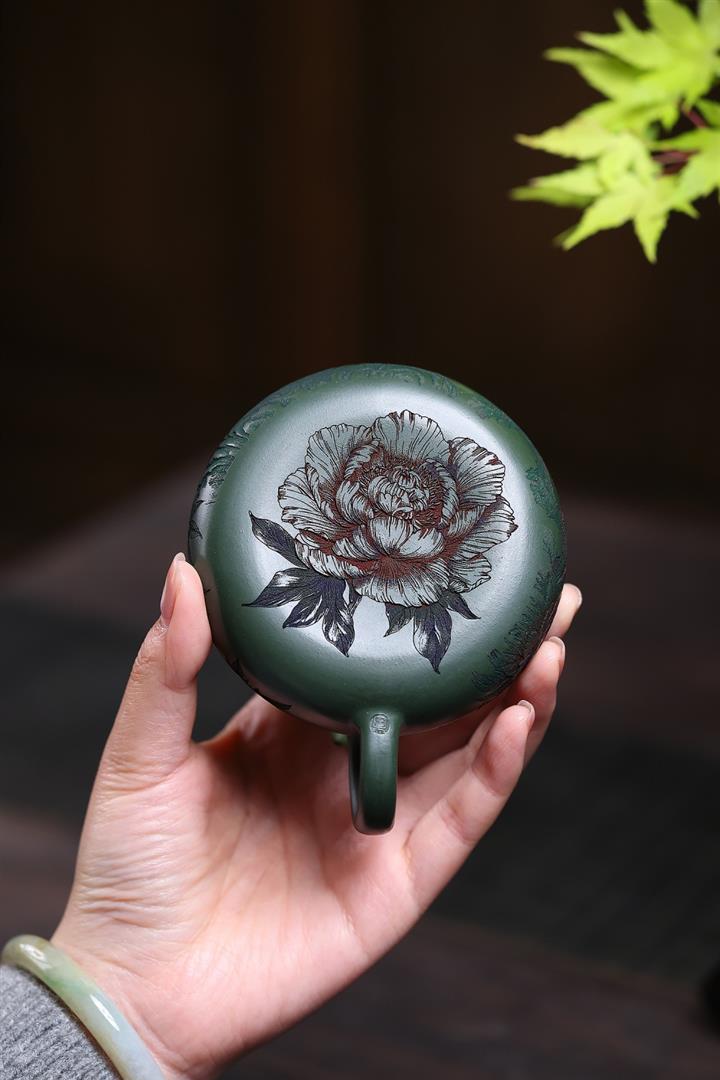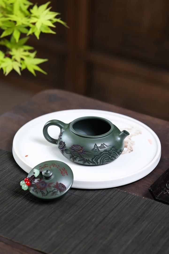 190cc原礦綠泥滿刻牡丹寒江泡茶壺POT10220